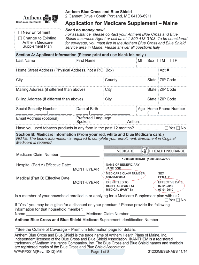 Anthem Blue Cross and Blue Shield 2 Gannett Drive South Portland, ME 041066911 Application for Medicare Supplement Maine New Enrollment Change to Existing Anthem Medicare Supplement Plan Send no money