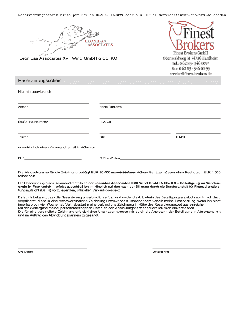 Get the free Reservierungsschein bitte per Fax an 062833460099 oder als PDF an servicefinestbrokers