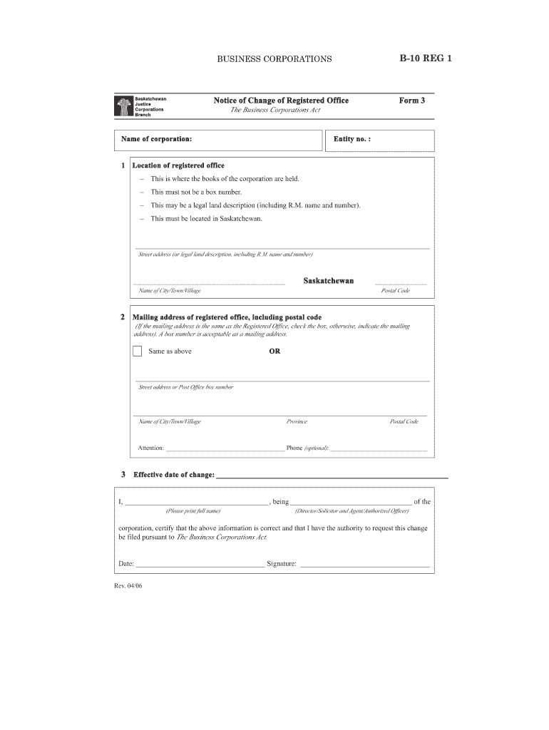 B10 REG 1 BUSINESS CORPORATIONS Saskatchewan Justice Corporations Branch Notice of Change of Registered Office Name of corporation: 1 Form 3 The Business Corporations Act Entity no. Location of registered