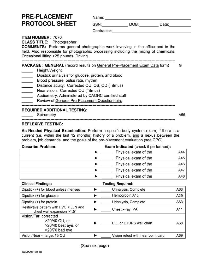 REPLACEMENT PROTOCOL SHEET Name: SSN: DOB: Date: Contractor: ITEM NUMBER: 7076 CLASS TITLE: Photographer I Comment: Performs general photographic work involving in the office and in the field. Also,