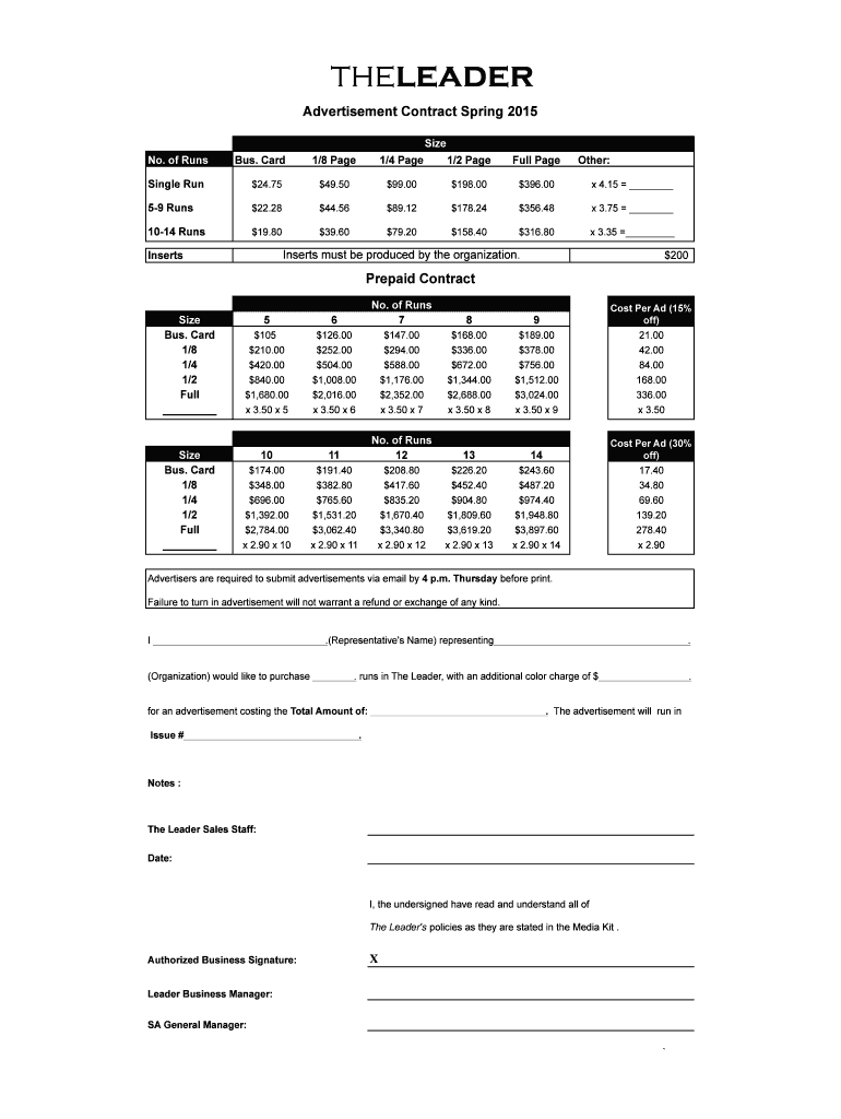 The leader Advertisement Contract Spring 2015 Size No. of Runs Bus. Card 1/8-Page 1/4-Page 1/2-Page Full Page Other: Single Run $$$$$24.7549.5099.00198.00396.00 × 4.15 59 Runs $$$$$22.2844.5689.12178.24356.48