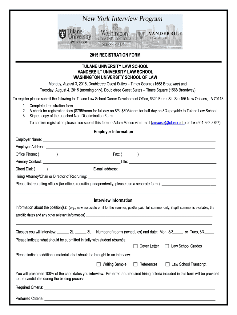 TULANE UNIVERSITY LAW SCHOOL VANDERBILT UNIVERSITY LAW SCHOOL WASHINGTON UNIVERSITY SCHOOL OF LAW 2015 New York Interview Program Monday, August 3, 2015 (full day) or Tuesday, August 4, 2015 (halfway
