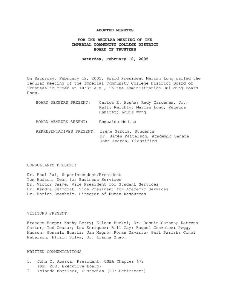 ADOPTED MINUTES FOR THE REGULAR MEETING OF THE IMPERIAL COMMUNITY COLLEGE DISTRICT BOARD OF TRUSTEES Saturday, February 12, 2005, On Saturday, February 12, 2005, Board President Marian Long called