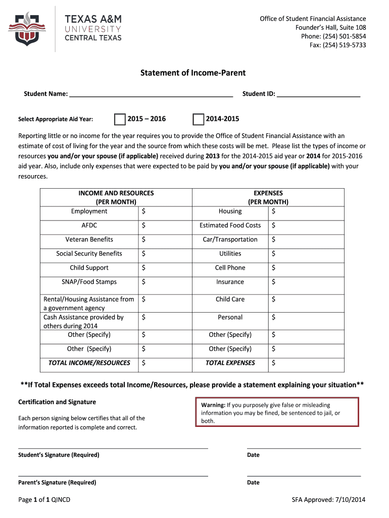 Office of Student Financial Assistance Founders Hall, Suite 108 Phone: (254) 5015854 Fax: (254) 5195733 Statement of Incompetent Student Name: Select Appropriate Aid Year: 2015 2016 Student ID: 20142015