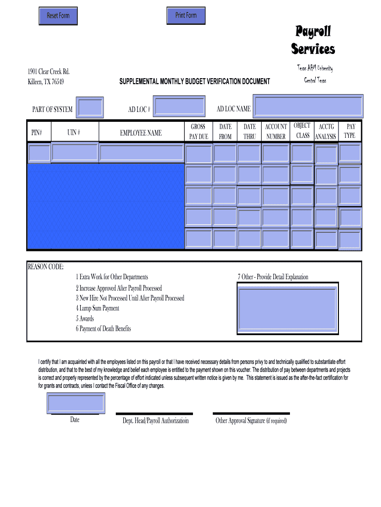 Print Form Reset Form Payroll Services 1901 Clear Creek Rd. Killeen, TX 76549 SUPPLEMENTAL MONTHLY BUDGET VERIFICATION DOCUMENT PIN# AD LOC NAME AD LOC # PART OF SYSTEM IN # EMPLOYEE NAME Texas A&M