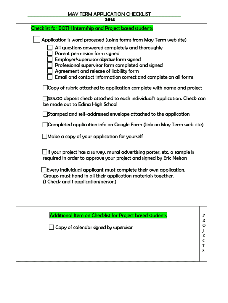 MAY TERM APPLICATION CHECKLIST 2014 Checklist for BOTH Internship and Project based students Application is word processed (using forms from May Term website) All questions answered completely and