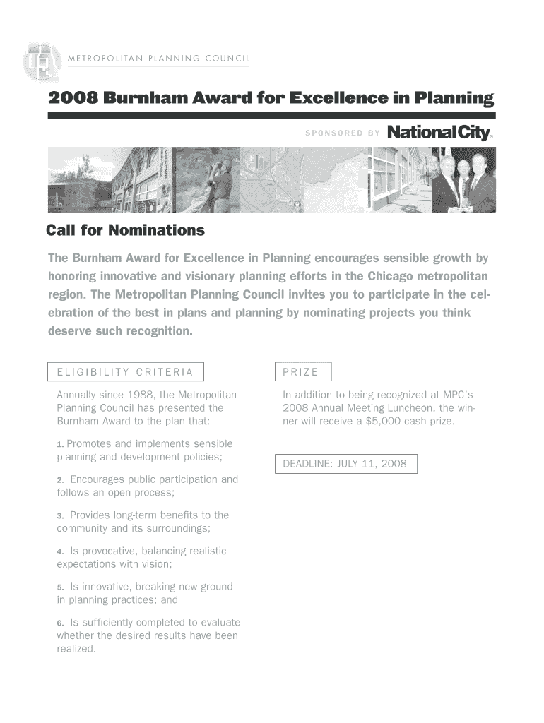 2008 Burnham Award for Excellence in Planning SPONSORED BY Call for Nominations The Burnham Award for Excellence in Planning encourages sensible growth by honoring innovative and visionary planning