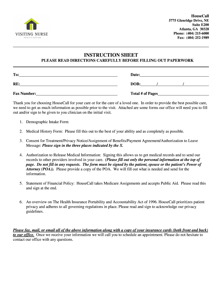 Household 5775 Glen Ridge Drive, NE Suite E200 Atlanta, GA 30328 Phone: (404) 2156000 Fax: (404) 2521989 INSTRUCTION SHEET PLEASE READ DIRECTIONS CAREFULLY BEFORE FILLING OUT PAPERWORK To: Date: RE: