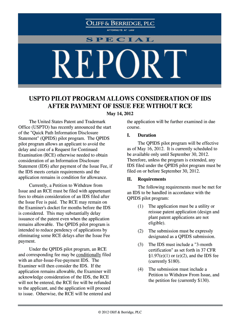 USPTO PILOT PROGRAM ALLOWS CONSIDERATION OF IDS AFTER PAYMENT OF ISSUE FEE WITHOUT RACE May 14, 2012, The United States Patent and Trademark Office (USPTO) has recently announced the start of the