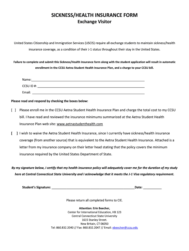 SICKNESS/HEALTH INSURANCE FORM Exchange Visitor United States Citizenship and Immigration Services (USCIS) require all exchange students to maintain sickness/health insurance coverage, as a condition