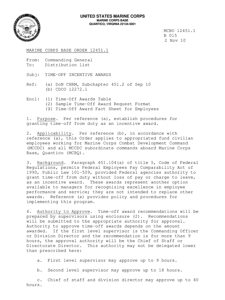 UNITED STATES MARINE CORPS BASE QUANTICO, VIRGINIA 221345001 MCB 12451.1 B 015 2 Nov 10 MARINE CORPS BASE ORDER 12451.1 From: To: Commanding General Distribution list Subj: TAKEOFF INCENTIVE AWARDS