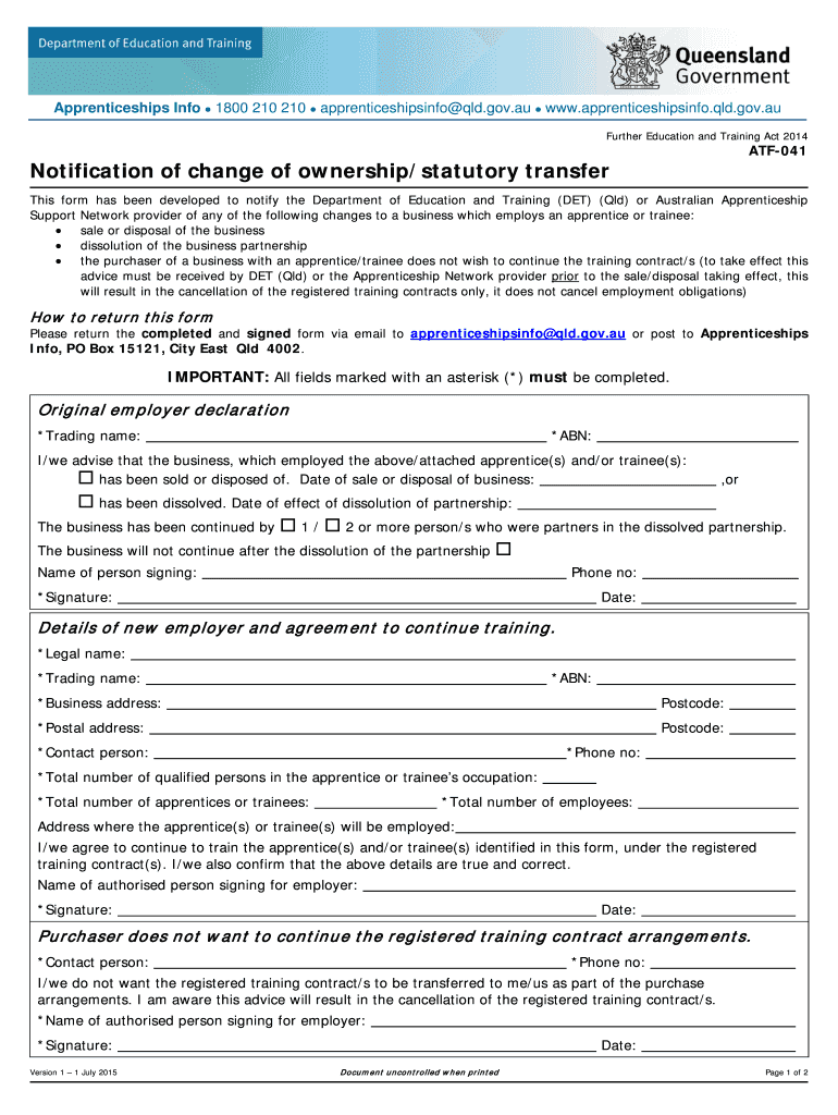 Apprenticeships Info 1800 210 210 apprenticeships info QLD.gov.AU www.apprenticeshipsinfo.qld.gov.au Further Education and Training Act 2014 ATF041 Notification of change of ownership/statutory transfer