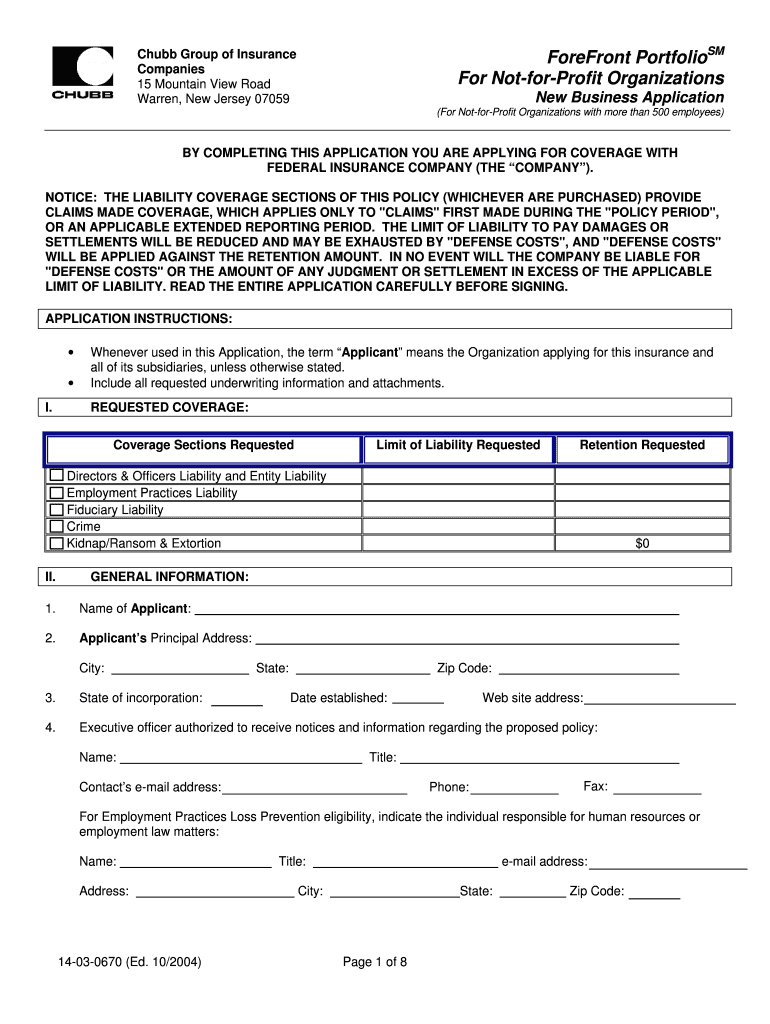 Forefront Portfolios For NotforProfit Organizations Chubb Group of Insurance Companies 15 Mountain View Road Warren, New Jersey 07059 New Business Application (For NotforProfit Organizations with