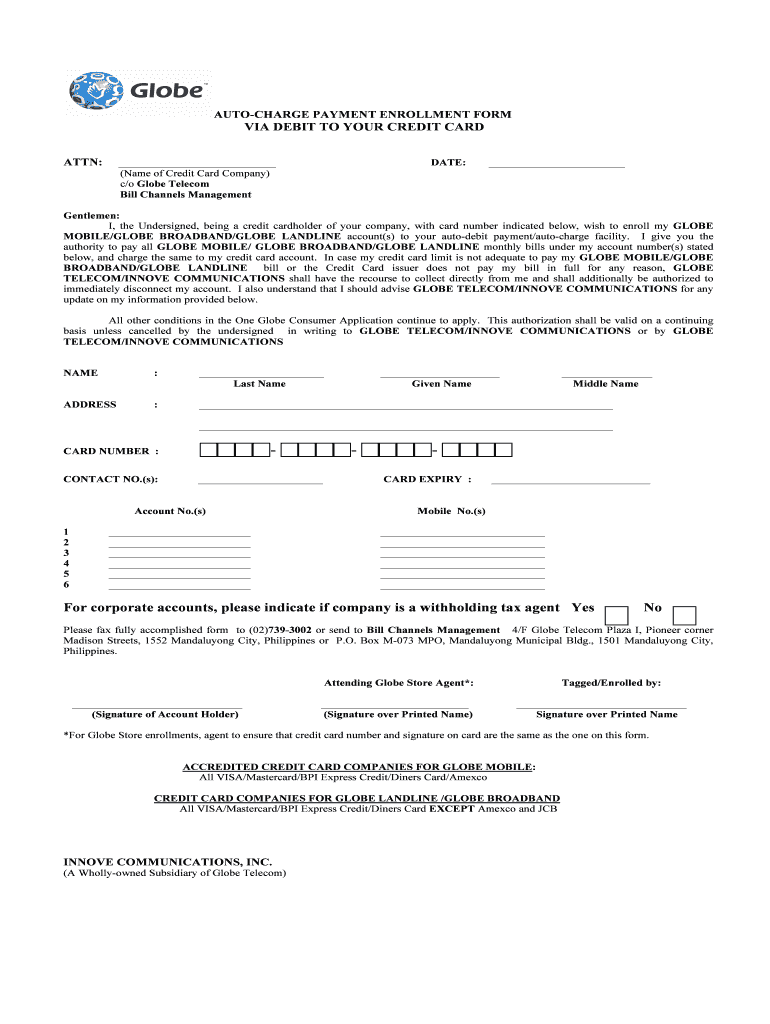 SURCHARGE PAYMENT ENROLLMENT FORM VIA DEBIT TO YOUR CREDIT CARD ATTN: DATE: (Name of Credit Card Company) c/o Globe Telecom Bill Channels Management Gentlemen: I, the Undersigned, being a credit cardholder
