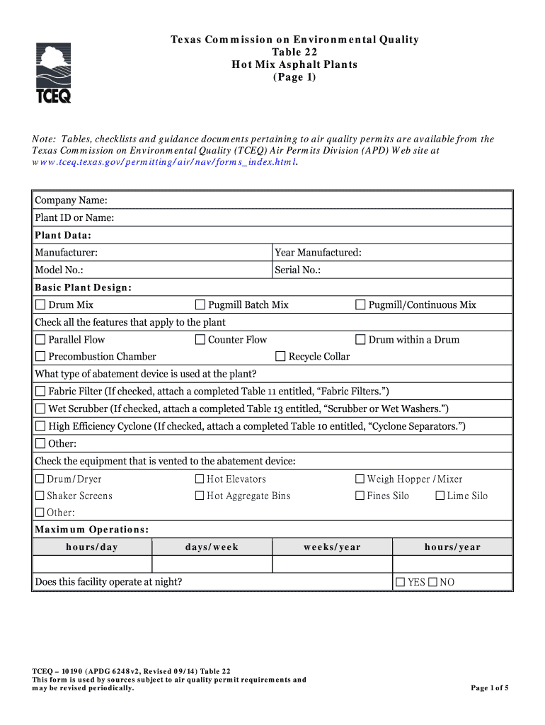 Texas Commission on Environmental Quality Table 22 Hot Mix Asphalt Plants (Page 1) Note: Tables, checklists and guidance documents pertaining to air quality permits are available from the Texas Commission