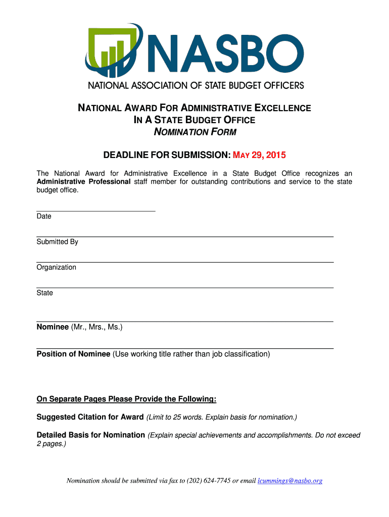 NATIONAL AWARD FOR ADMINISTRATIVE EXCELLENCE IN A STATE BUDGET OFFICE NOMINATION FORM DEADLINE FOR SUBMISSION: MAY 29, 2015, The National Award for Administrative Excellence in a State Budget Office