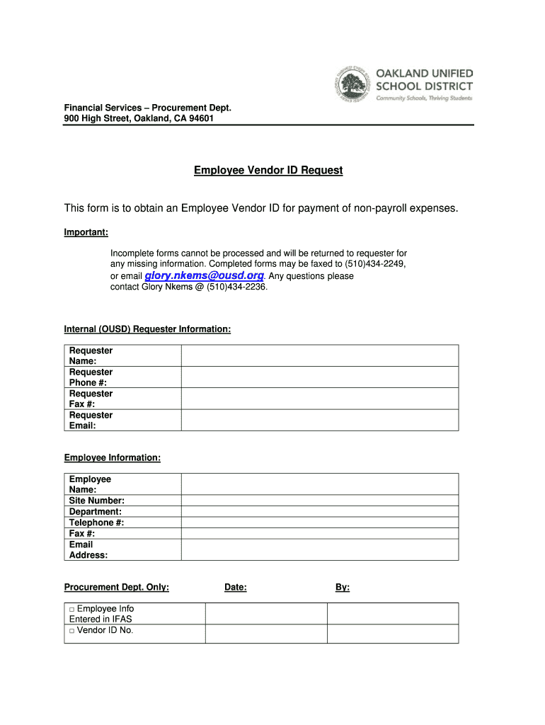 Financial Services Procurement Dept. 900 High Street, Oakland, CA 94601 Employee Vendor ID Request This form is to obtain an Employee Vendor ID for payment of nonpayroll expenses. Important: Incomplete