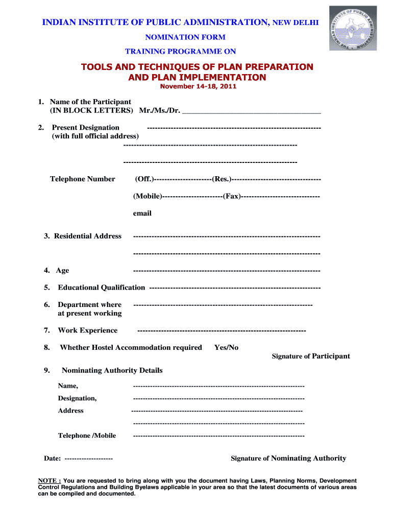 INDIAN INSTITUTE OF PUBLIC ADMINISTRATION, NEW DELHI NOMINATION FORM TRAINING Program ON TOOLS AND TECHNIQUES OF PLAN PREPARATION AND PLAN IMPLEMENTATION November 1418, 2011 1. Name of the Participant