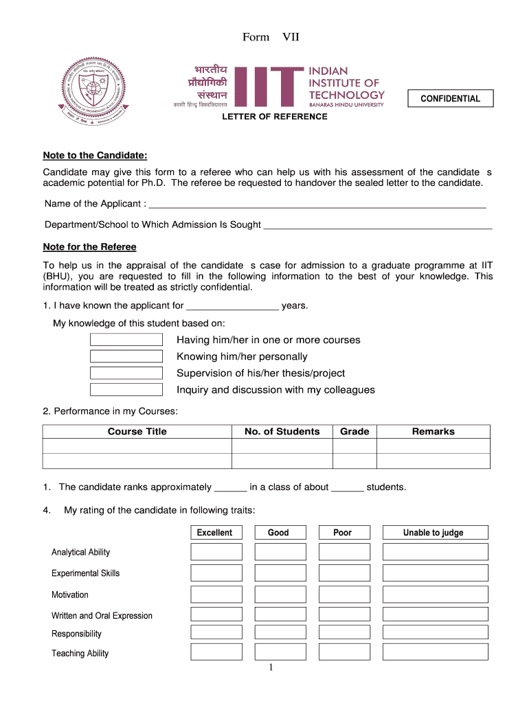 Form VII CONFIDENTIAL LETTER OF REFERENCE Note to the Candidate: Candidate may give this form to a referee who can help us with his assessment of the candidate s academic potential for Ph.D. The referee