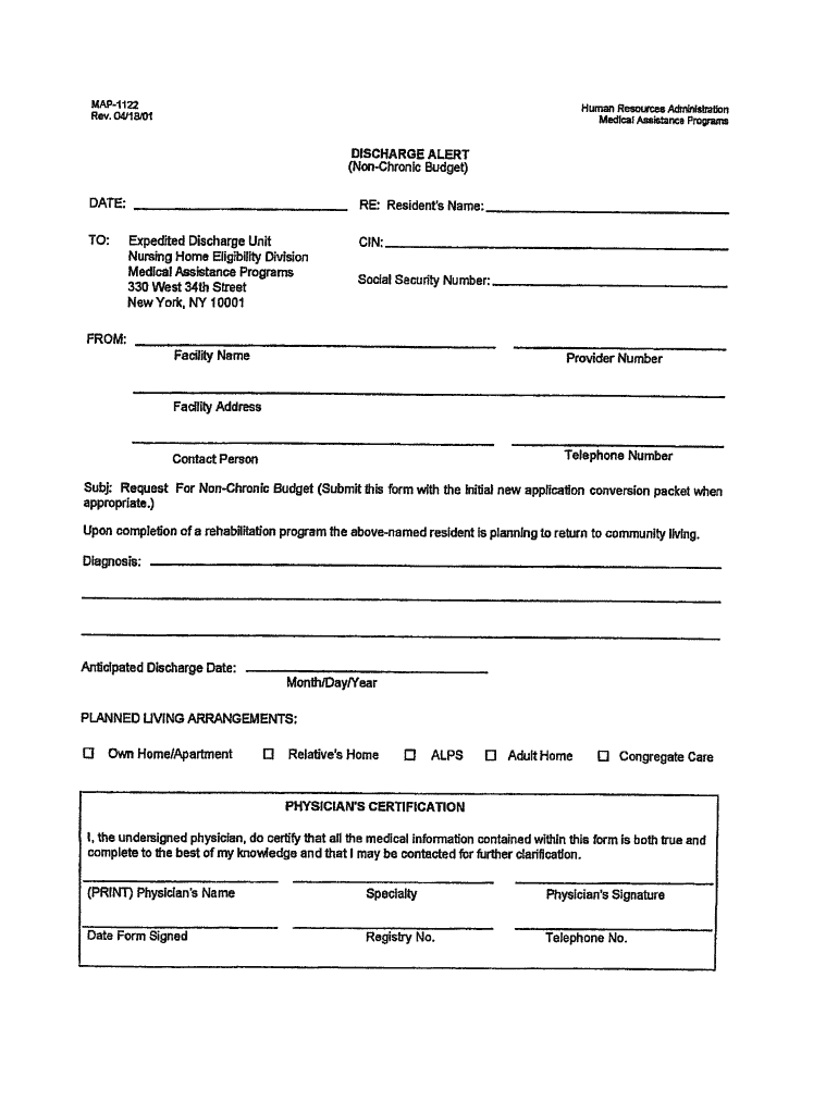 Human Remarks Adminl4ration Medical Assidilnca Program MAP1124 Rev. 04/18M1 DISCHARGE ALERT RE: Resident's Name: DATE: TO: Expedited Discharge Unit Nursing Home EligibilityDivision Medical Assistance