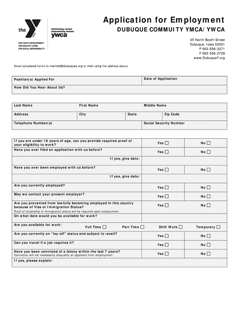Application for Employment DUBUQUE COMMUNITY YMCA/YWCA 35 North Booth Street Dubuque, Iowa 52001 P 5635563371 F 5635562728 www.DubuqueY.org Email completed forms to Arnold Dubuque.org or mail using