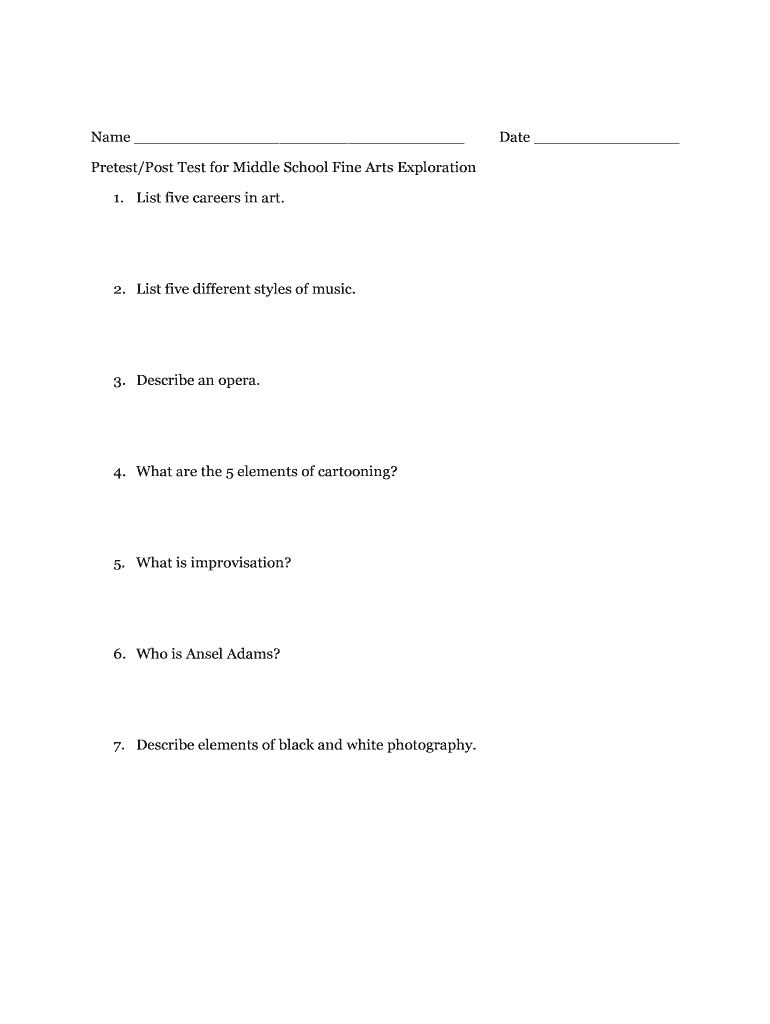 Name Pretest/Post Test for Middle School Fine Arts Exploration 1. List five careers in art. 2. List five different styles of music. 3. Describe an opera. 4. What are the 5 elements of cartooning?