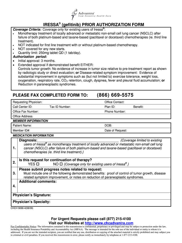 IRE SSA (gefitinib) PRIOR AUTHORIZATION FORM Coverage Criteria: Coverage only for existing users of Cressey: Monotherapy treatment of locally advanced or metastatic nonsmall cell lung cancer (NS CLC)