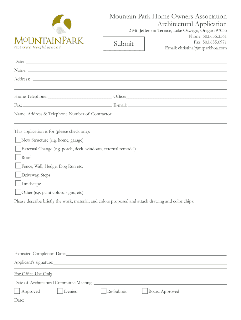 Mountain Park homeowners Association Architectural Application 2 Mt. Jefferson Terrace, Lake Oswego, Oregon 97035 Phone: 503.635.3561 Fax: 503.635.0971 Email: Christina mtparkhoa.com Architectural