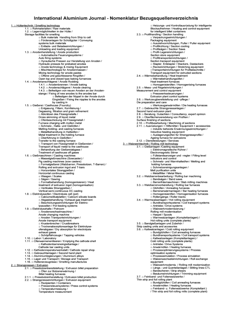 International Aluminum Journal Nomenclature Bezugsquellenverzeichnis 1. 2. Httentechnik / Smelting technology 1.1. Rohmaterialien / Raw materials 1.2. Lagermglichkeiten in her Hate / Storage facilities