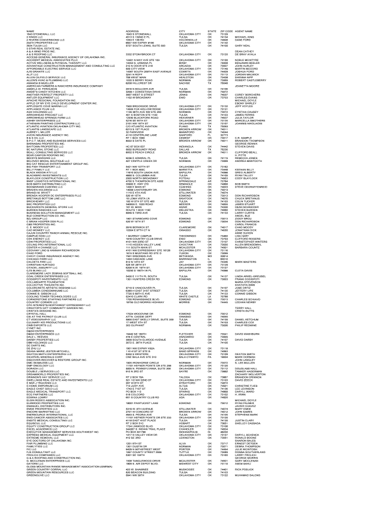 NAME 1643 STONEWALL LLC 2 KINGS LLC 2 RIVERS CONVERSIONS LLC 234TH PROPERTIES LLC 2624 TULSA LLC 5 STAR REAL ESTATE INC. A & A WIND PROS INC. A & S ROOFING LLC ACCESS GENERAL INSURANCE AGENCY OF OKLAHOMA