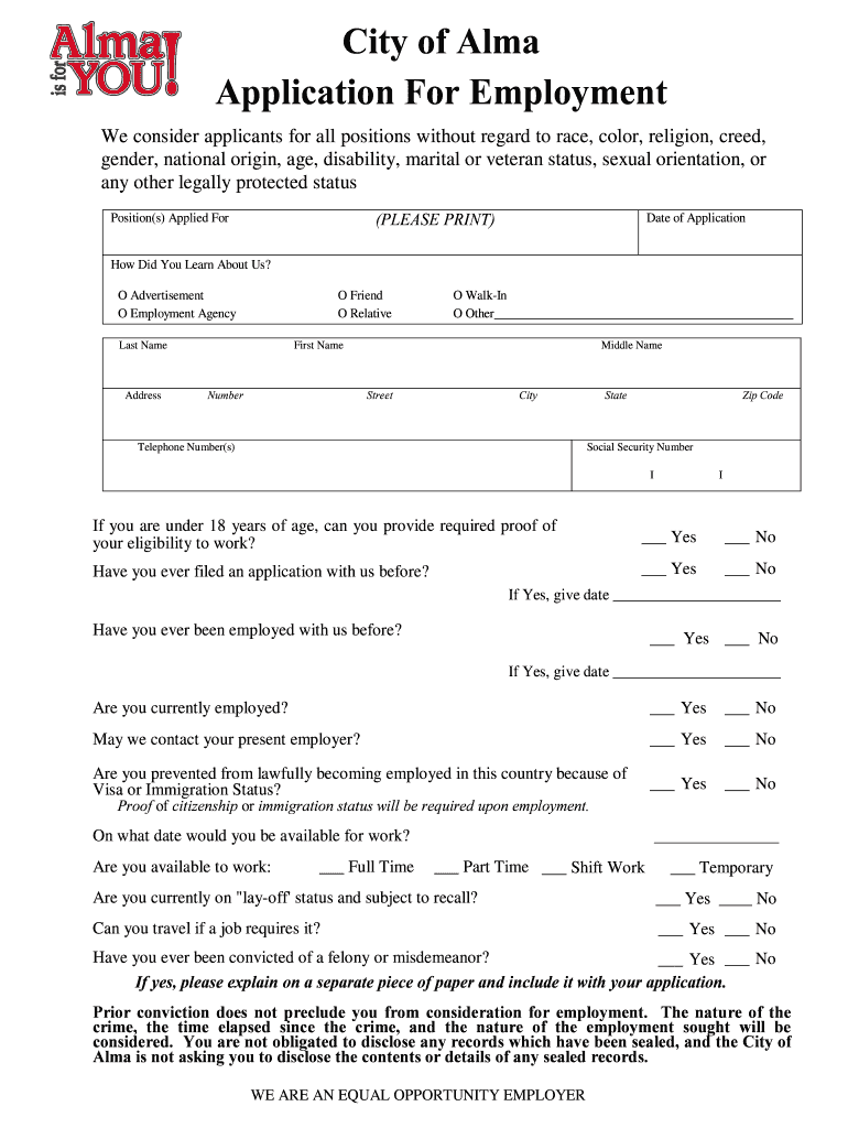 City of Alma Application For Employment We consider applicants for all positions without regard to race, color, religion, creed, gender, national origin, age, disability, marital or veteran status,