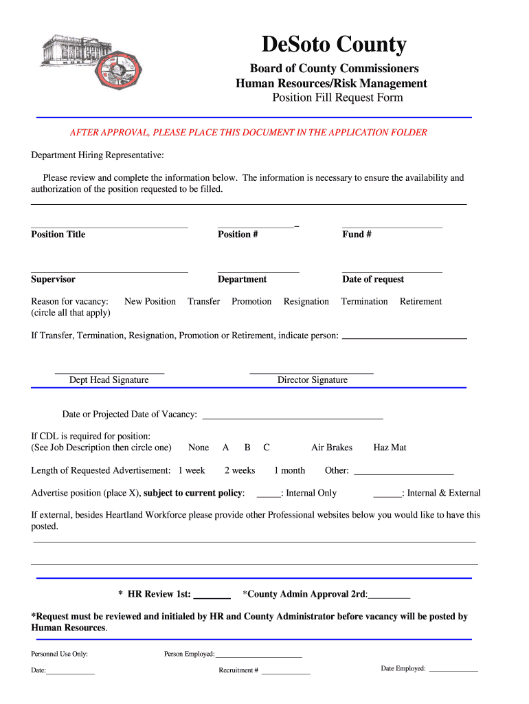 DeSoto County Board of County Commissioners Human Resources/Risk Management Position Fill Request Form AFTER APPROVAL, PLEASE PLACE THIS DOCUMENT IN THE APPLICATION FOLDER Department Hiring Representative: