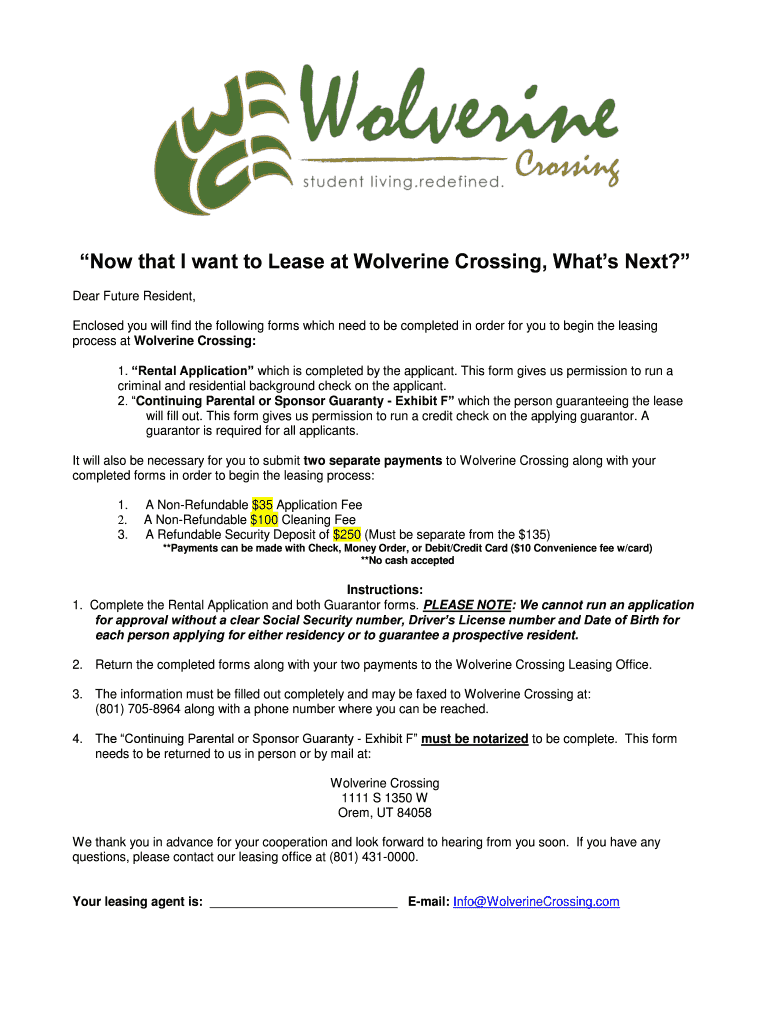 Now that I want to Lease at Wolverine Crossing, What's Next? Dear Future Resident, Enclosed you will find the following forms which need to be completed in order for you to begin the leasing process