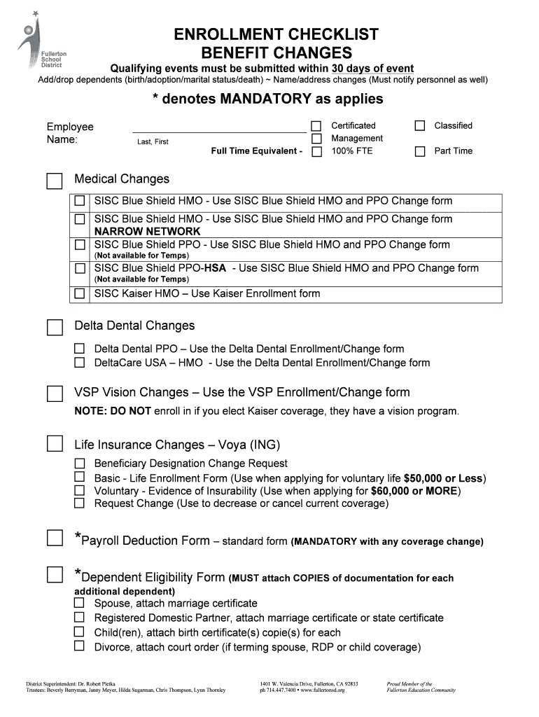 ENROLLMENT CHECKLIST BENEFIT CHANGES Fullerton School District Qualifying events must be submitted within 30 days of event Add/drop dependents (birth/adoption/marital status/death) Name/address changes