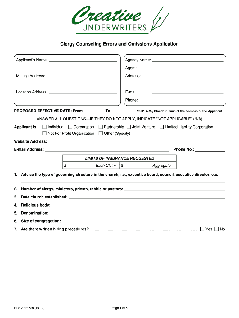 Clergy Counseling Errors and Omissions Application Applicants Name: Agency Name: Agent: Mailing Address: Address: Location Address: Email: Phone: PROPOSED EFFECTIVE DATE: From To 12:01 A.M., Standard