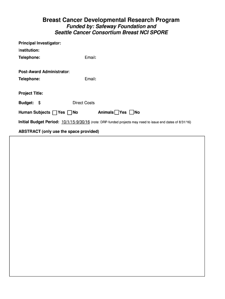 Notice of Availability of Funds for Pilot Projects Breast Cancer Developmental Research Program Funded by: Safeway Foundation and Seattle Cancer Consortium Breast NCI SPORE Proposals due: Revised