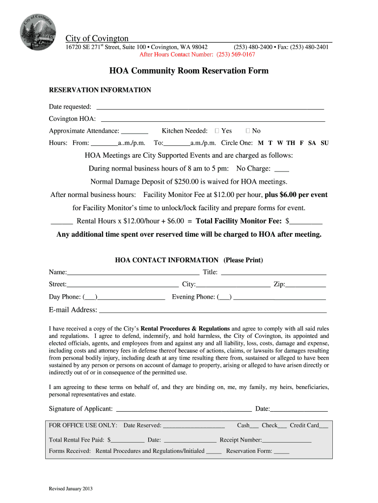 Get the free HOA Community Room Reservation Form - covingtonwa