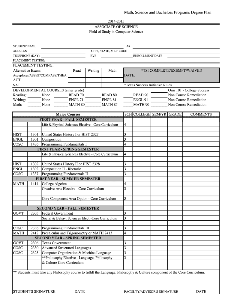 Math, Science and Bachelors Programs Degree Plan 20142015 ASSOCIATE OF SCIENCE Field of Study in Computer Science STUDENT NAME A# ADDRESS CITY, STATE, & ZIP CODE TELEPHONE (DAY) EVE ENROLLMENT DATE