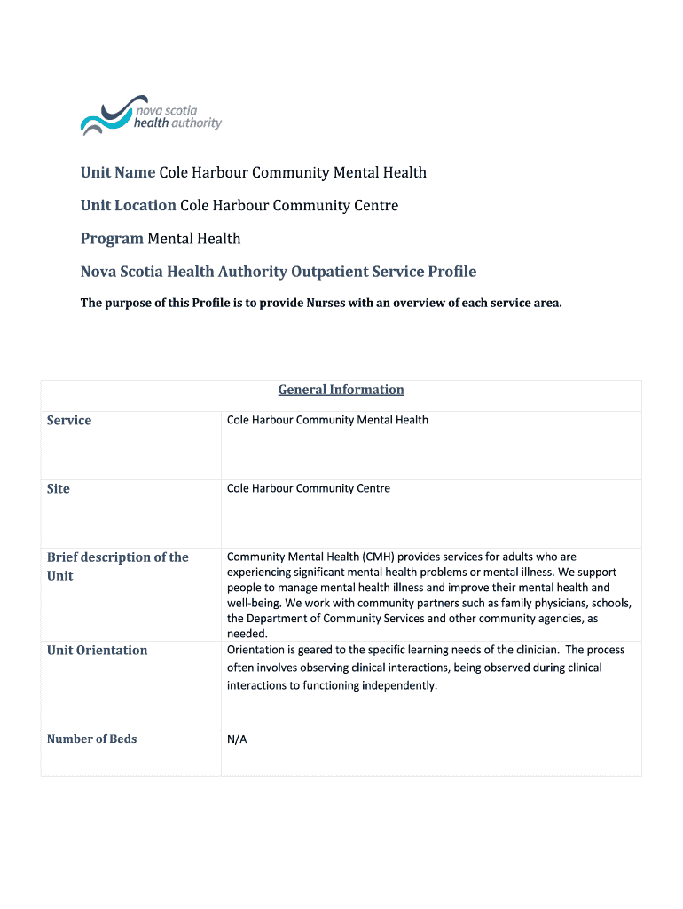 Unit Name Cole Harbor Community Mental Health Unit Location Cole Harbor Community Center Program Mental Health Nova Scotia Health Authority Outpatient Service Profiles The purpose of this Profile