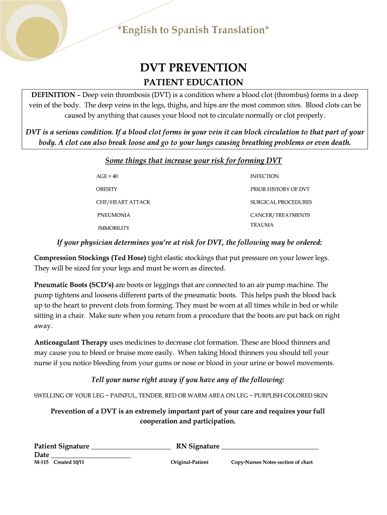 *English to Spanish Translation* DVT PREVENTION PATIENT EDUCATION DEFINITION Deep vein thrombosis (DVT) is a condition where a blood clot (thrombus) forms in a deep vein of the body. The deep veins