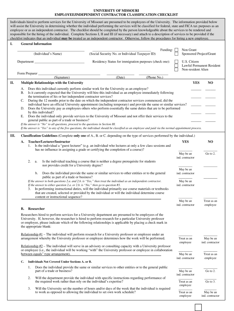 UNIVERSITY OF MISSOURI EMPLOYEE/INDEPENDENT CONTRACTOR CLASSIFICATION CHECKLIST Individuals hired to perform services for the University of Missouri are presumed to be employees of the University.