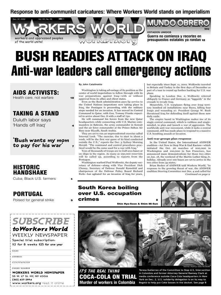 Response to anticommunist caricatures: Where Workers World stands on imperialism Dec. 12, 2002 Vol. 44, No. 49 50 ESTA DOS UNIDO Guerra no coming y recorded en presupuestos estates ya Ronda 12 BUSH