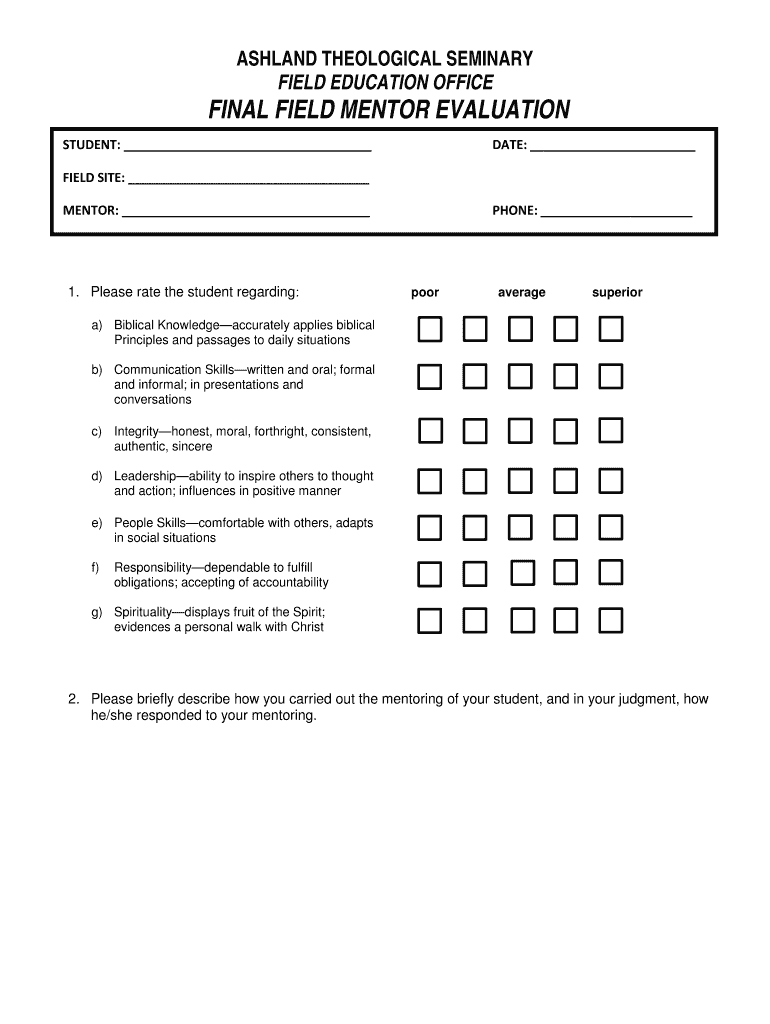 ASHLAND THEOLOGICAL SEMINARY FIELD EDUCATION OFFICE FINAL FIELD MENTOR EVALUATION STUDENT: DATE: FIELD SITE: MENTOR: 1. Please rate the student regarding: PHONE: poor average superior a) Biblical