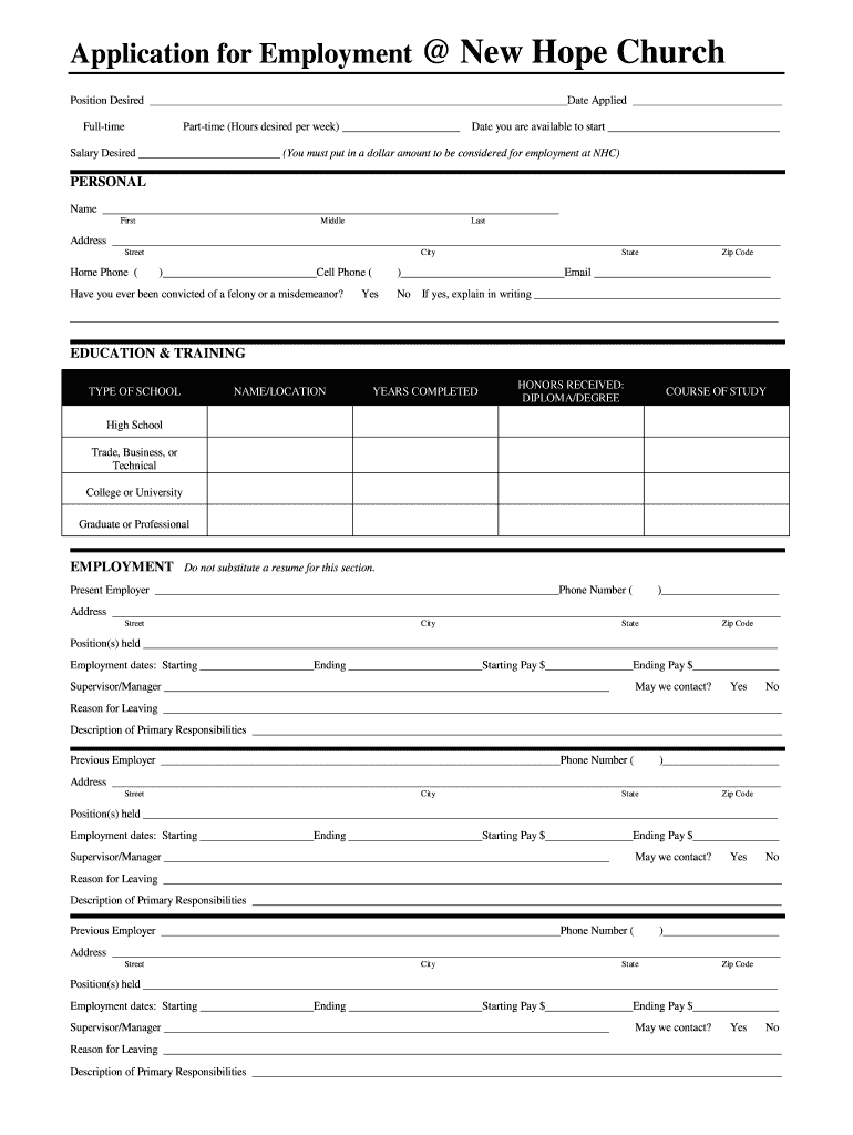 Application for Employment New Hope Church Position Desired Date Applied Full time Part time (Hours desired per week) Salary Desired Date you are available to start (You must put in a dollar amount