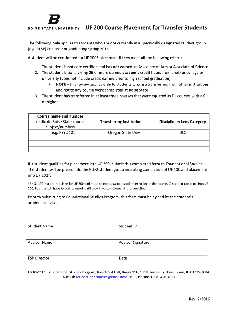 Get the free UF 200 Course Placement - Office of the Registrar - registrar boisestate