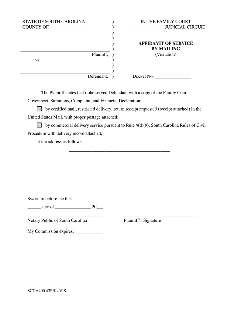 STATE OF SOUTH CAROLINA COUNTY OF)))))) Plaintiff,) ))) Defendant. ) vs. IN THE FAMILY COURT JUDICIAL CIRCUIT AFFIDAVIT OF SERVICE BY MAILING (Visitation) Docket No. The Plaintiff states that (s)he