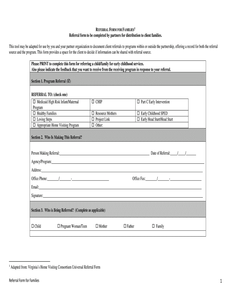 Referral form for families1 is a document used to refer families to receive specific services or support.