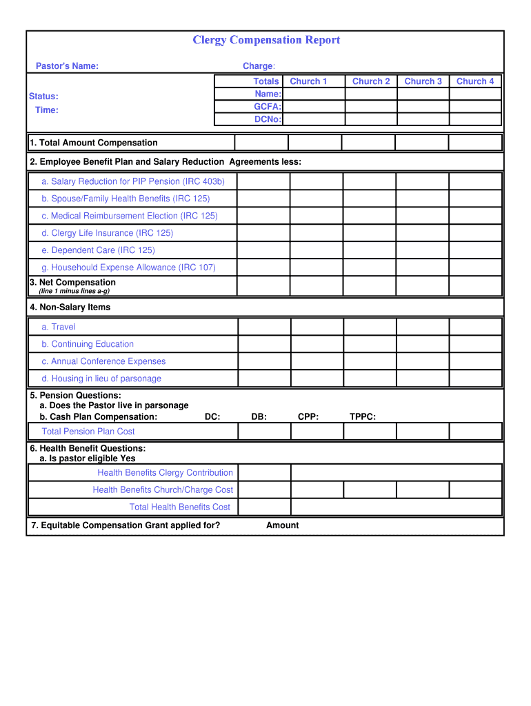 Clergy Compensation Report Pastor's Name: Charge: Totals Church 1 Name: CFA: Dino: Status: Time: Church 2 1. Total Amount Compensation 2. Employee Benefit Plan and Salary Reduction Agreements less: