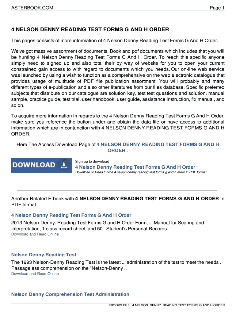 ASTERBOOK.COM Page 1 4 NELSON DENNY READING TEST FORMS G AND H ORDER This pages consists of more information of 4 Nelson Denny Reading Test Forms G And H Order. We've got massive assortment of documents,