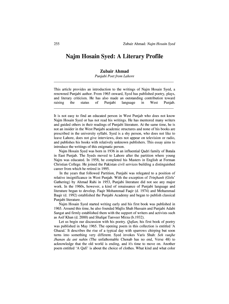 255 Rubier Ahmad: Nam Hosier Syed Nam Hosier Syed: A Literary Profile Rubier Ahmad Punjabi Poet from Lahore This article provides an introduction to the writings of Nam Hosier Syed, a renowned Punjabi